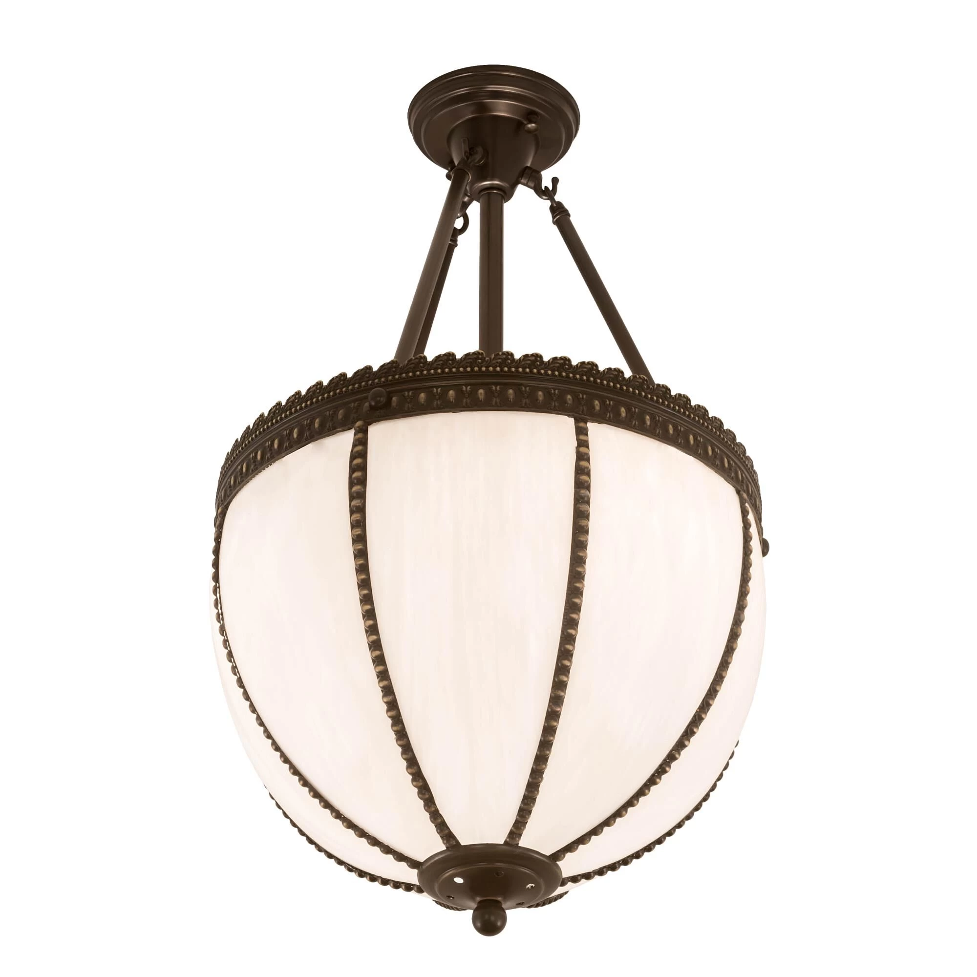 Created with Brass and Glass. Shansky is an elegant ceiling fixture featuring beaded filigree with a miniature button and bow design accenting the decorative trim. Matching filigree creates a classic design on this White art glass diffuser which is created using Meyda Tiffany’s famous copperfoil construction and accented with a matching finial. The Brass decorative accents; frame and hardware are featured in a Craftsman Brown finish. Custom crafted in our 180;000 square foot manufacturing facility in Upstate New York in Yorkville; NY. Offered in custom sizes; styles; and colors. Dimmable energy efficient lamping available. UL and cUL listed for damp and dry locations.