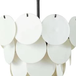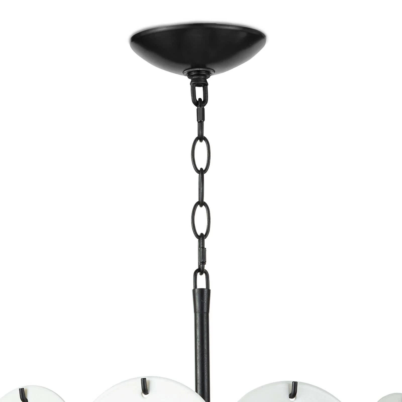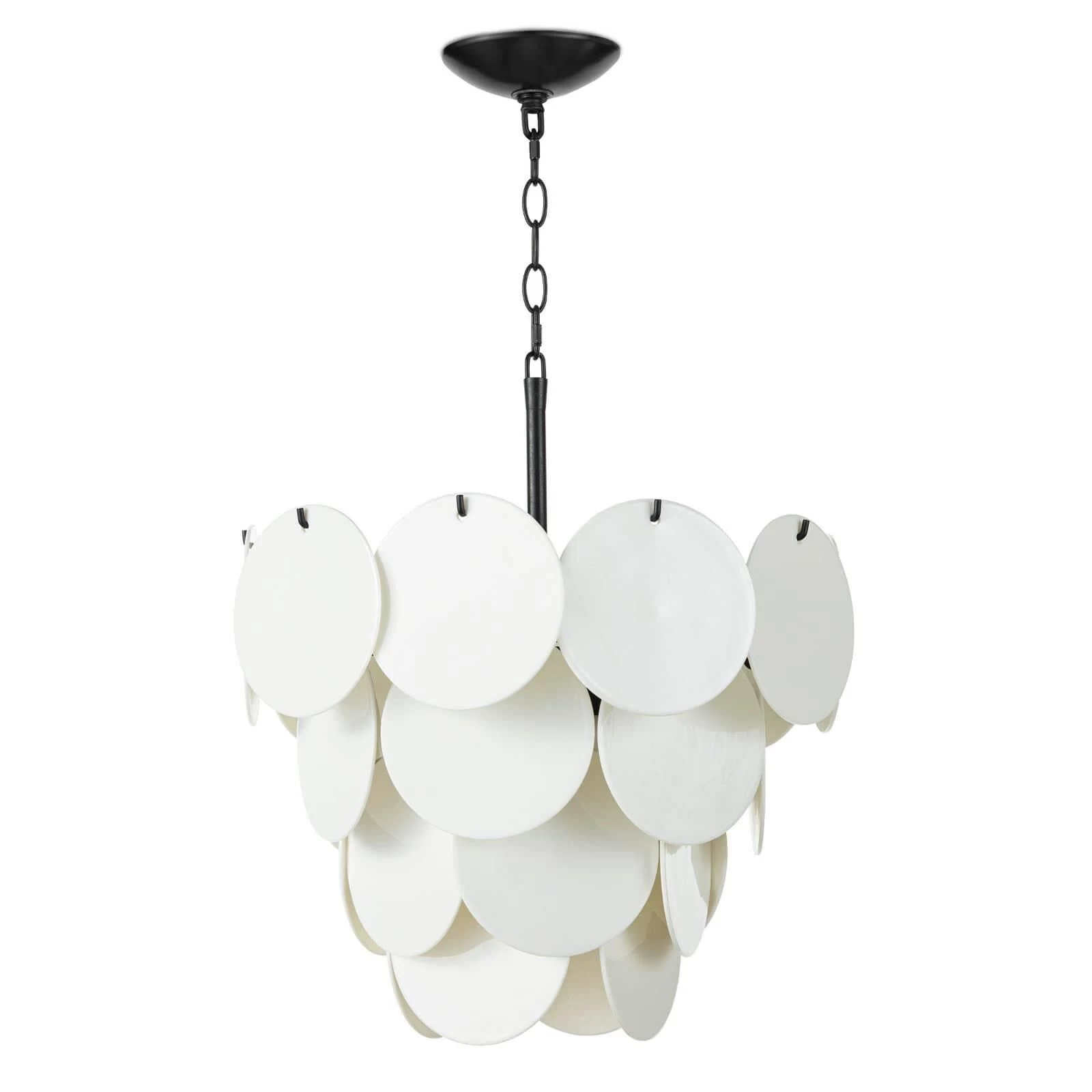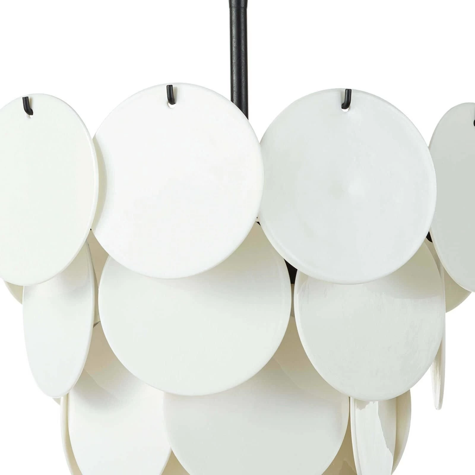 White-glazed glass discs hang from a simple, blackened iron frame giving the Solstice Chandelier its distinct, modern appeal. This crisp, sculptural chandelier is a beautiful piece both illuminated or not.