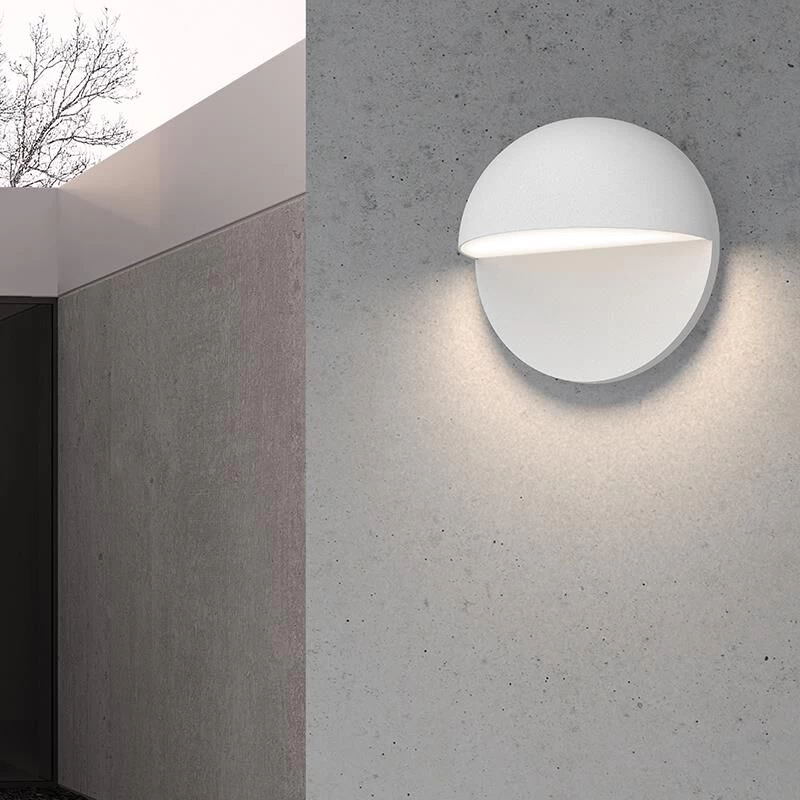 A cast aluminum half dome on a circular disc integrates harmonious geometry across volume and plane, directing light downward.