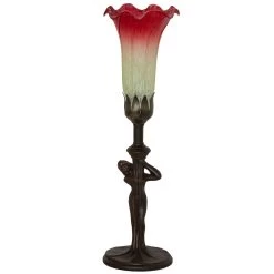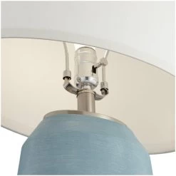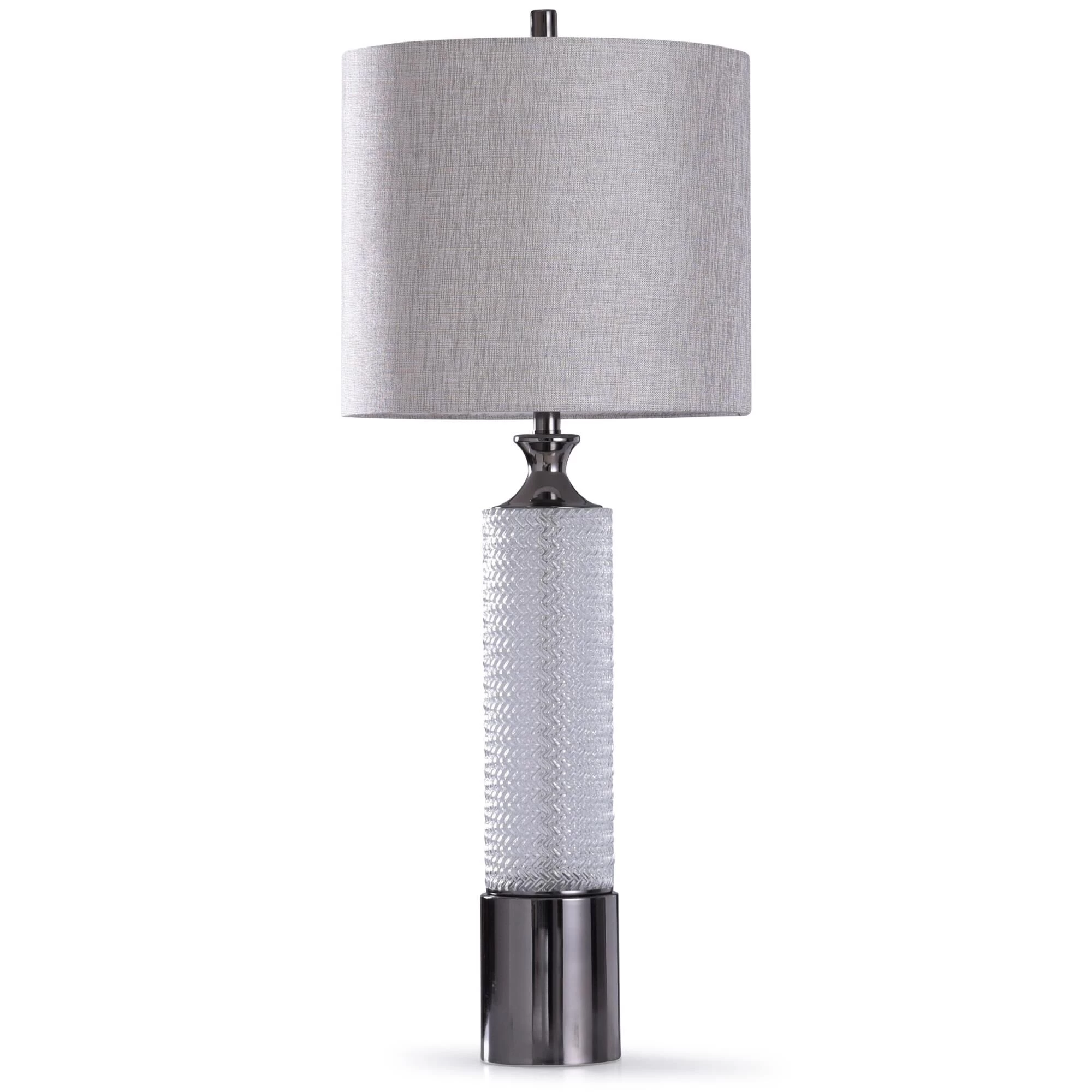A striking transitional table lamp showcases an effective mix of materials. Using a herringbone glass body with a gorgeous steel base, the frame presents an appealing two-tone effect. The designer grey shade features a mix of rayon and polyester and adds an exquisite accent. This lamp brings overt glam style to modern dining rooms, living rooms and foyers.