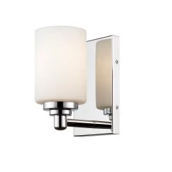 Let your bathroom, bedroom or hallway bask in soft, warm light. This contemporary one-light wall sconce has a sophisticated, streamlined look, and extends from a rectangular mirrored plate for extra gleam. From the sconce’s cylindrical white etched glass shade to its chrome finish, this fixture stylishly upgrades your space.